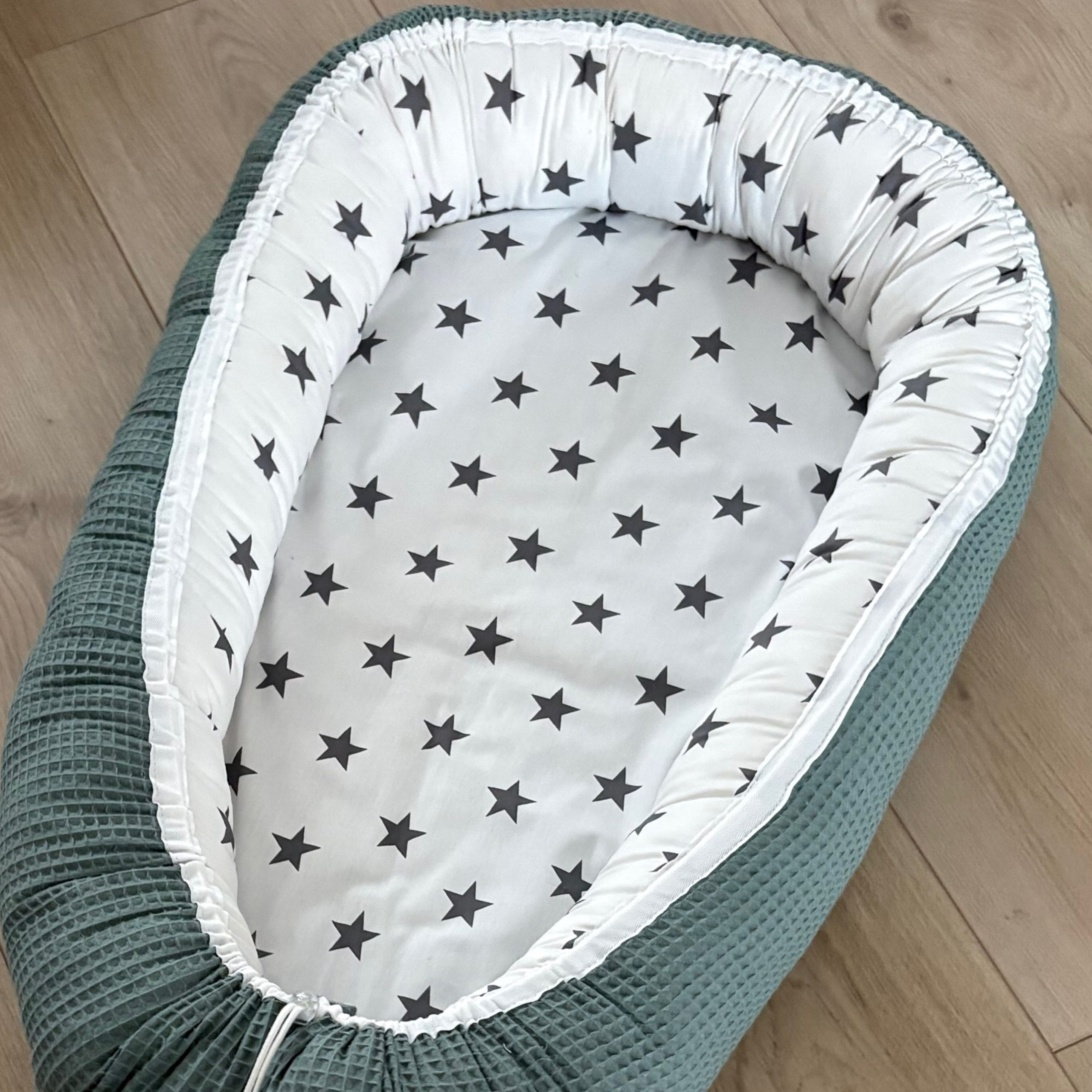 OP VOORRAAD babynestje wafelgroen met grijze sterren