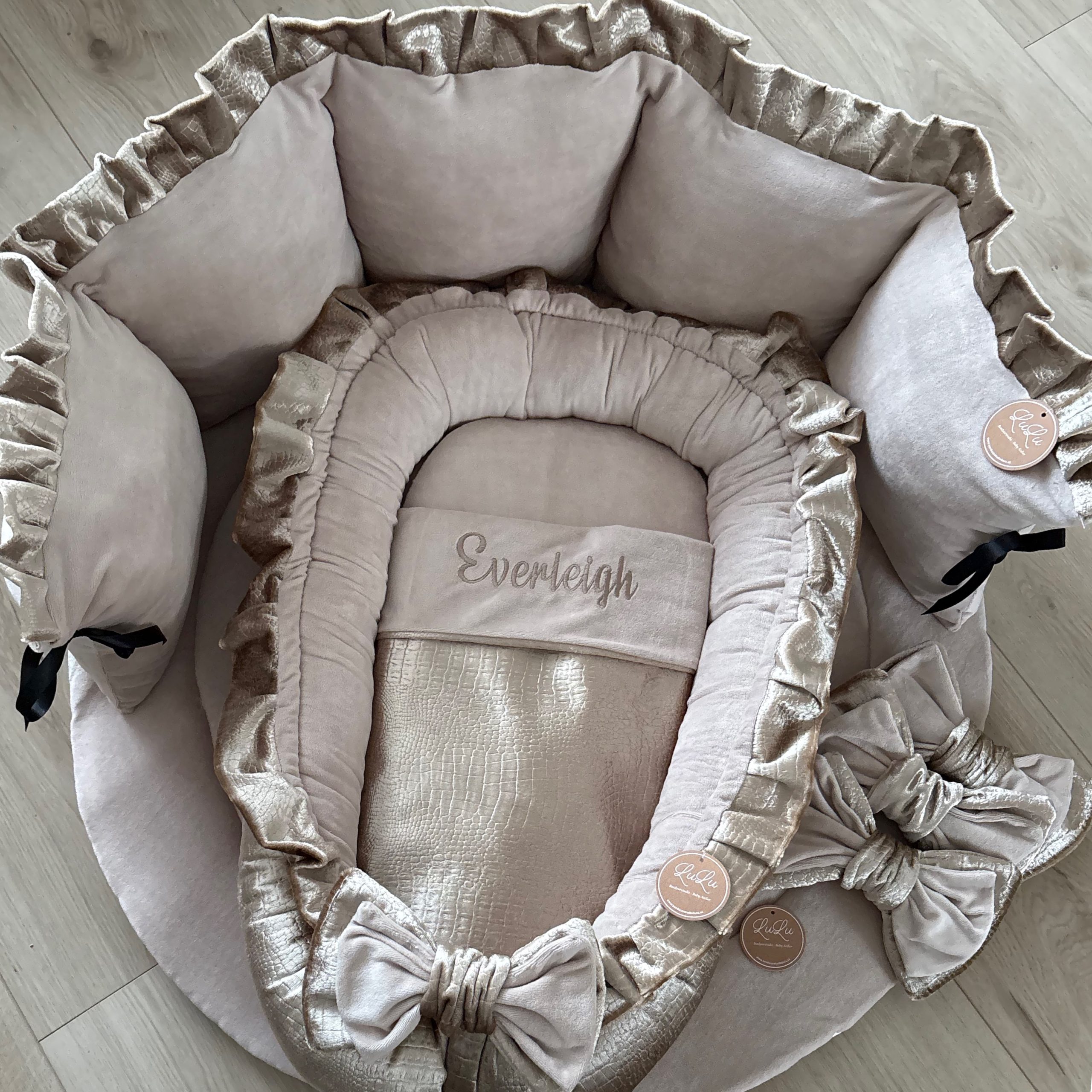 boxset Briony heeft een boxkleed met aan de ene zijde een velvet goud crocostofje en de andere zijde beige Nicky velours een boxbumper van Nicky velours afgezet met een roezel van goud crocostofje, het babynestje is aan de buitenzijde croco velvet en de binnenzijde beige velvet afgezet met het goud crocostofje, en 3 boxrikken