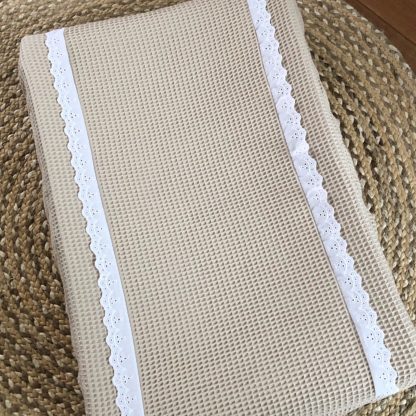 De hoes voor het aankleedkussen heeft aan 2 kanten een broderie kanten strook en aan weerszijden hiervan komt de wafelstof terug u heeft keuze uit diverse kleurtjes Wafelstof van 100% katoen.