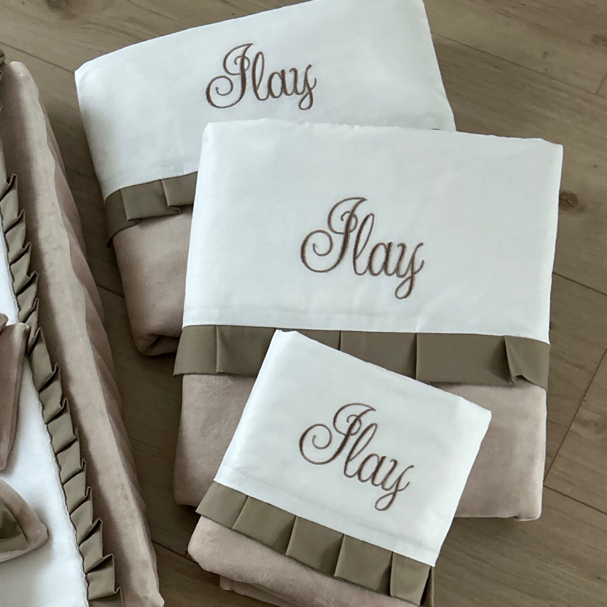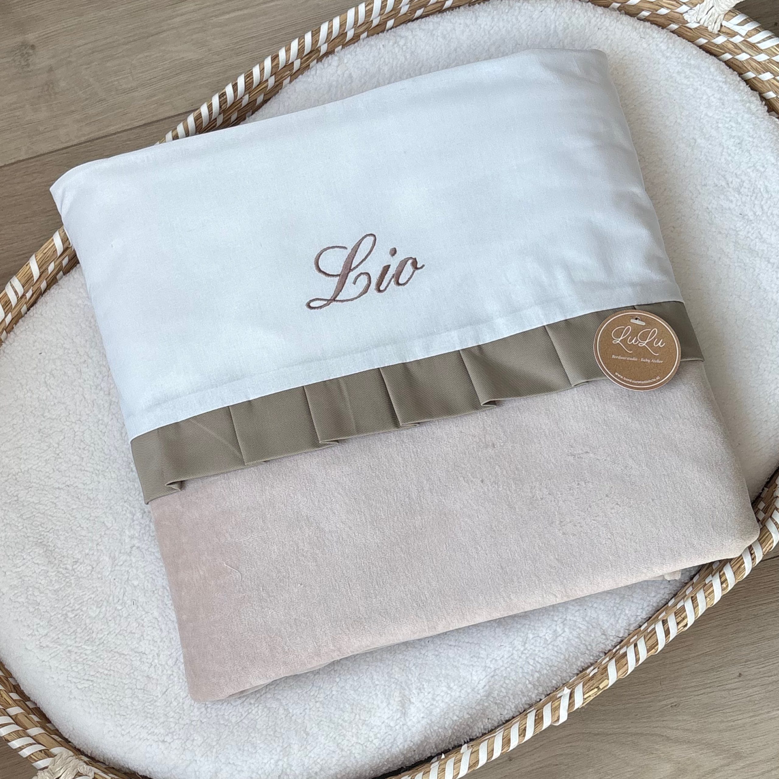 Personaliseren: Je kunt het dekentje laten borduren met de naam van jouw kindje, noteer de naam in het vakje “gewenste Naam, kleur borduurgaren en lettertype” onder het dropdown menu en het wordt speciaal voor gemaakt.
