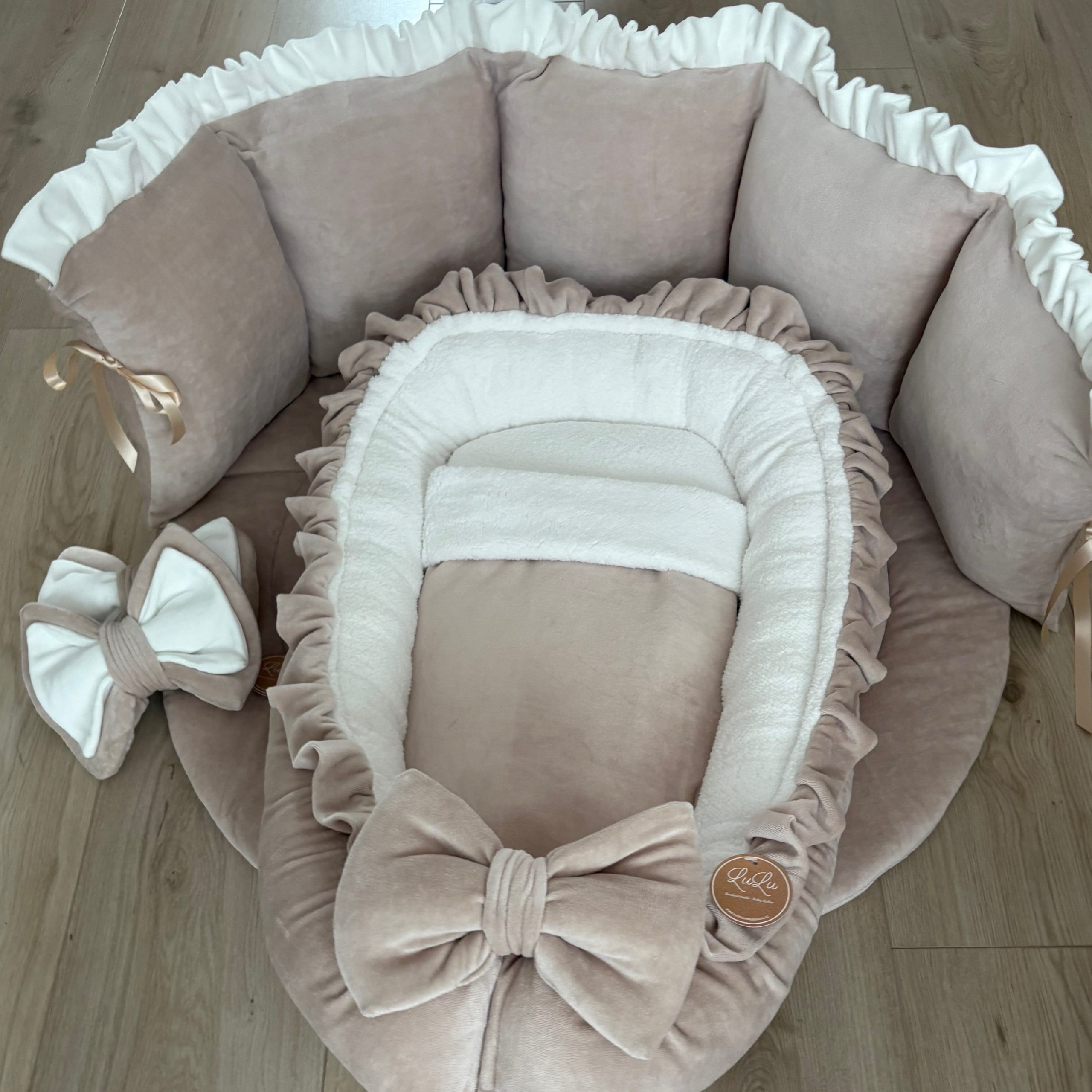 - Box set Velvet met roezels, u heeft keuze voor een ronde box uit een halve boxrand of helemaal rondom, voor een 4-kanten of rechthoekig box ontvangt u 3 delen. Babynestje met roezels compleet met uitneembaar matrasje en dekentje