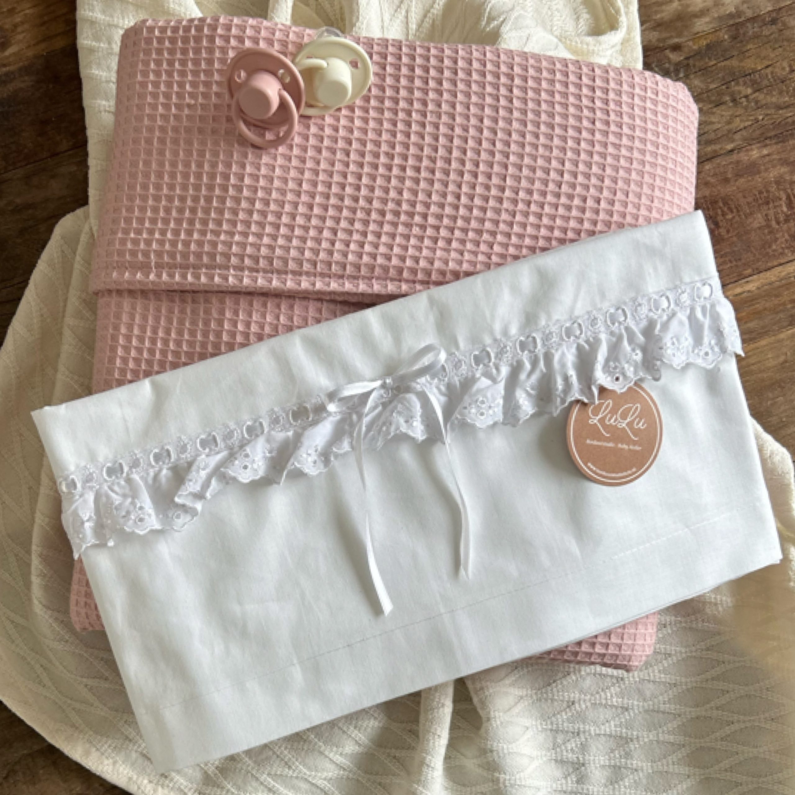 Deze lakentjes zijn van wit katoen met een kantje en strikje kleur naar keuze, u legt het lakentje onder uw gebreide of wafelstof dekentje en slaat de strook met print terug over het dekentje, zo heeft u dekentje een eigen uitstraling. Dekentjes zijn apart verkrijgbaar